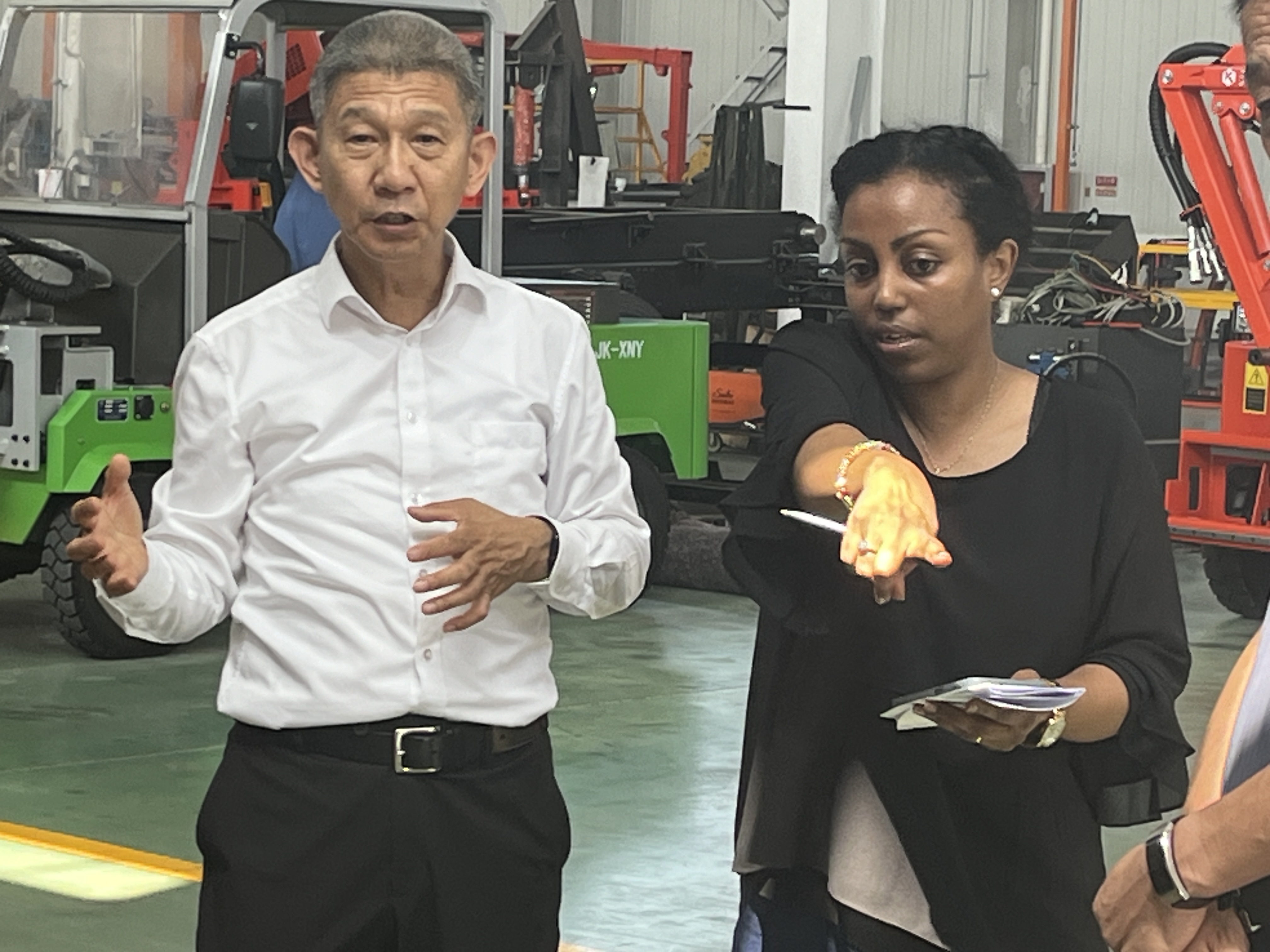 考察團(tuán)由我司劉總親自接待,在部門負(fù)責(zé)人和工程師的引領(lǐng)下,客人們參觀了我們的總裝車間,參觀了我司研發(fā)生產(chǎn)的各種機(jī)型。通過總裝車間中產(chǎn)品詳盡的介紹,埃塞俄比亞客戶對我司的技術(shù)創(chuàng)新能力及市場適應(yīng)性有了更為直觀的認(rèn)識。